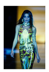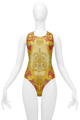 Resurrection Vintage is excited to offer a Versace 1992 red and gold stretchy bodysuit and pant ensemble featuring a baroque ornate print on the fabric, an invisible zipper on the back of the bodysuit, and an elastic waistband for the pants.