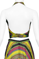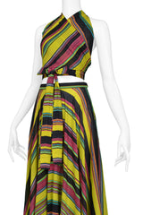 Resurrection Vintage is excited to offer a vintage 1970s Yves Saint Laurent chartreuse wrap top & skirt ensemble with multi-color stripes. The top features a wrap-around front tie closure and an open back.