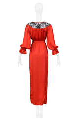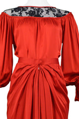Resurrection Vintage is excited to offer this stunning vintage Yves Saint Laurent red satin and black lace evening ensemble featuring a delicately gathered blouse with lace yoke, 3/4 length sleeves with ruffle cuffs, and a matching pleated straight maxi skirt with a high waistband, hook and eye closure, and front center zipper.