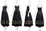 Resurrection Vintage is excited to offer a vintage Yves Saint Laurent black and gold corset top and fancy peasant skirt ensemble, The corset features laces up the front, fitted body and gold trim. The skirt features a full body, gold trim and taffeta underskirt and ruffles. a blouse with taffeta trim at the collar, cuffs, and hem, gold buttons on the cuffs, and a matching skirt with waistband, side zipper, and gathered full skirt.
