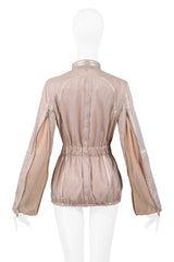 Resurrection Vintage is excited to offer a vintage Gianfranco Ferre blush pink nylon windbreaker jacket featuring double zippers at front, four flap pockets with buckle closures, zippers at sleeves with inset mesh panels, and drawstring at hem.