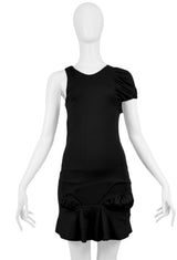 Resurrection Vintage is excited to offer a vintage Helmut Lang black asymmetrical drape bubble dress featuring one gathered sleeve, one deep cut tank strap, a fitted body, insets, and flounce hemline. From the 2004 collection.