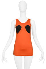 Resurrection Vintage is excited to offer a vintage bright orange Helmut Lang sleeveless tank top featuring a scoop neckline, trim around the neck and armholes, black insets over the bust, and a hip-length body.