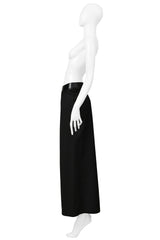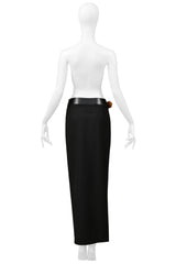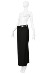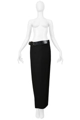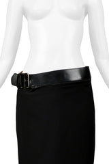 Resurrection Vintage is excited to offer a vintage Jean Paul Gaultier black gabardine straight skirt featuring a black hard leather belt with a wrap-around zipper, flat front, belt loop at the center back and ankle length.