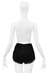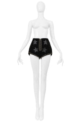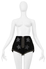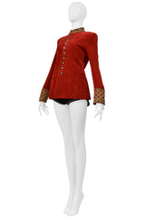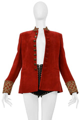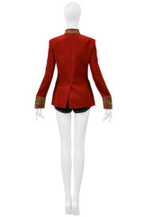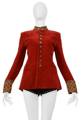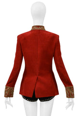 Resurrection Vintage is thrilled to present a stunning ensemble from Saint Laurent Paris, featuring a luxurious red velvet jacket paired with black corduroy star shorts from the 2018 collection. The jacket boasts a single-breasted front closure, a high neck, slit pockets, and intricate gold embroidery on the cuffs and collar. The matching shorts are designed as hot pants, embellished with leather star appliqués and silver-tone studs for a striking look.