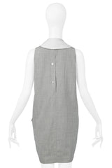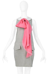 Resurrection Vintage is excited to offer a vintage Isaac Mizrahi grey sleeveless lightweight wool dress with detachable white cotton collar, button back bodice, front flap pockets, and large pink silk bow. 1989 Collection.