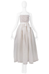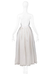 Resurrection Vintage is excited to offer a vintage Isaac Mizrahi off-white silk gazar halter gown featuring a long full gathered skirt, open back, contrasting fabric wrap belt, and raw hem. 100% silk.
