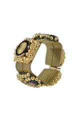 Resurrection Vintage is excited to offer a one-of-a-kind Richard Minadeo large scale brass link bracelet with red and black components, vintage decorative dials, and gold studs set in gold resin. Sold exclusively at Resurrection.