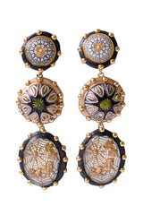 Resurrection Vintage is excited to offer a pair of Richard Minadeo one-of-a-kind clips earrings featuring multicolor decorative floral pieces, white and gold lady and spider intaglio rounds, and gold studs set in black and gold resin.