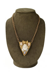 Resurrection Vintage is excited to offer a one-of-a-kind Richard Minadeo necklace featuring a vintage chain, multicolor lava portrait cameos, a gold owl cameo, gold studs, and set in gold resin.