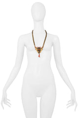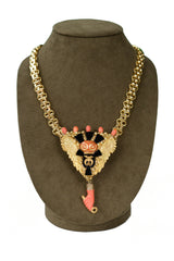 Resurrection Vintage is excited to offer a one-of-a-kind Richard Minadeo necklace featuring a vintage brass link chain, faux coral hand, red & gold owl, and cast brass wings set in gold resin. Sold exclusively at Resurrection.