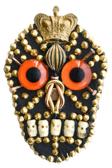 Richard Minadeo one-of-a-kind skull brooch featuring orange glass eyes, skull teeth, gold metal crown, and gold studs set in black resin and made exclusively for Resurrection Vintage.