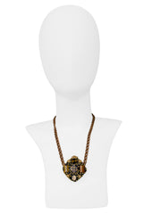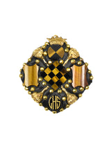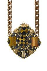 Resurrection Vintage is excited to offer a one-of-a-kind Richard Minadeo Monogram necklace that features a vintage chain, pendant, tiger eye and onyx pieces, vintage monogram, and crown set in gold resin. Sold exclusively at Resurrection.