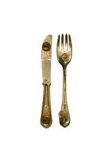 Resurrection Vintage is excited to offer a vintage Moschino gold-tone knife and fork brooch pins with double pins on the back.