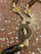 Resurrection Vintage is excited to present a vintage Yves Saint Laurent glass, bead, and metal findings, and cord necklace. Stamped YSL.