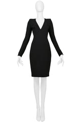 Resurrection is excited to offer a stunning vintage John Galliano black widow cocktail dress featuring a deep V neckline, long sleeves with covered buttons, shoulder pads, curved seams, and a fitted body. From the 1997 collection.