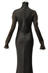 Resurrection Vintage is excited to offer a stunning vintage John Galliano bronze satin gown featuring a high collar neck, signature Galliano bias cut body, dramatic extra long sleeves with bell cuffs and buttons, classic multi button-back closure, and gown length with train.