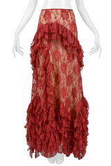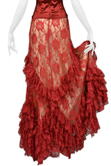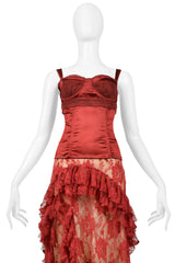 Resurrection Vintage is delighted to offer a romantic vintage John Galliano red evening ensemble featuring a dramatic ballgown length skirt with a high slit, lace ruffle layers, solid off-white lining, an invisible zipper at the back, and metal Galliano tag at the top right hip. The top features corset boning, lace trim detailing, lace overlay on cups and chest band, and a metal Galliano tag at the front right bottom.