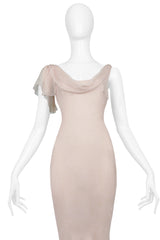Resurrection is excited to offer a stunning vintage John Galliano pink blush evening gown featuring a draped neckline, exposed back, ruffles, covered buttons at the sides, and dramatic gown length.