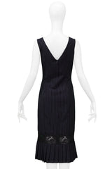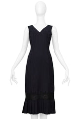 Resurrection is excited to offer a vintage John Galliano navy blue wool dress with pinstripes featuring a V front and back neckline, sleeveless, and pleated hem with lace detail.