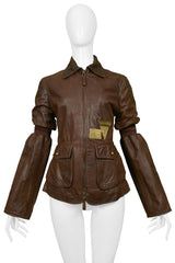 Resurrection is excited to offer a vintage Gianfranco Ferre brown leather aviator jacket featuring two front flap pockets, a two-way center-front zipper with leather pulls, brass hardware, buttons, signature plaques, and striped bands above the elbows and across the back waist.