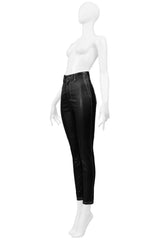 Resurrection Vintage is thrilled to present a pair of Givenchy by Riccardo Tisci black leather pants with stretch featuring a high-waist and slim fit, white stitching, side pockets, back pockets, double-bonded lining, and a center-front zip.