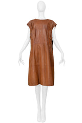 Resurrection Vintage is excited to offer a vintage Maison Martin Margiela cognac brown leather dress from the 2001 oversized collection, featuring a round neckline, a sleeveless, oversized fit, leather panels and seams, an interior lining, a center back zipper, and an above-the-knee length.