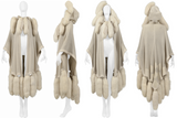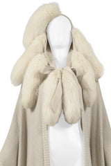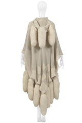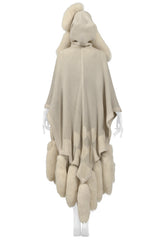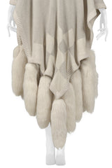 Resurrection is excited to offer a vintage Parisian off-white and grey knit cape featuring large white fur tails on the hood and hem, white leather diamond patchwork detailing at the back, ribbed edges, and neck tie closure.
