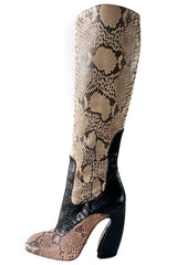 Resurrection Vintage is excited to offer a pair of Prada snakeskin boots featuring natural, black, and pink panels, a curved heel, and inside zippers.