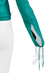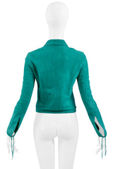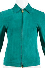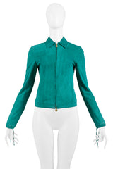 Resurrection Vintage is excited to offer a vintage Versace teal green suede jacket featuring a center front zipper with gold Medusa zipper pulls, and slits at lower sleeves with ties at cuffs.