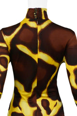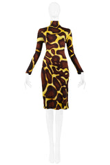 Resurrection Vintage is excited to offer a vintage Versace chestnut brown and banana yellow giraffe print turtleneck long-sleeved dress featuring a removable tan and brown fur collar and center back zipper and gemstone button closure.