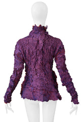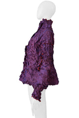 Resurrection Vintage is excited to offer a vintage Issey Miyake Pleats Di Miyake purple high neck long sleeve top from the 2002-03 collection, featuring a crushed pleated effect, red contrast exposed seams, ruffled stand up collar, and a fitted silhouette.