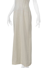 Resurrection Vintage is thrilled to present a vintage Yohji Yamamoto long white dress with contrast stitching from the spring 2000 collection, featuring a straight neckline, red and black stitching, sleeveless, center back zipper, short slit at the back hem, and ankle length.