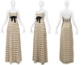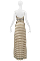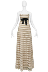 Resurrection Vintage is delighted to present a vintage off-white Valentino evening gown. The dress features satin ribbon and tulle stripes, an attached clear crystal rhinestone belt, and a black satin ribbon bow. It has an open neckline with skinny straps, an open back, and a dramatic gown length. The dress comes with its original tags and has never been worn.