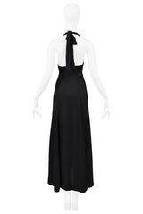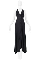 Resurrection Vintage is excited to offer a vintage Ossie Clark black moss crepe maxi dress featuring a halter neck, tie back, center-front buttons, and a relaxed skirt. Circa 1969.