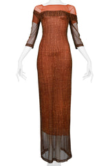 Resurrection Vintage is excited to present a vintage Plein Sud burgundy mesh maxi dress featuring an attached orange under layer with short sleeves and exposed neckline, abstract dot print, 3/4 sleeves, and long length.