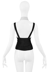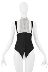 Resurrection Vintage is pleased to offer a vintage Rifat Ozbek black vest-style top with attached white ruffle collar, suspender straps, center front button closure, and pointed hem.