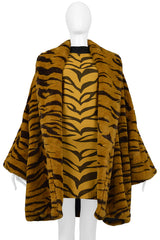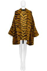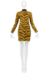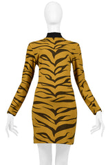 Resurrection Vintage is excited to offer a vintage Rifat Ozbek orange and black tiger dress featuring a high black collar, long sleeves, body-con fit, and mid-thigh length. Seen with our Rifat Ozbek Faux Fur Tiger coat.
