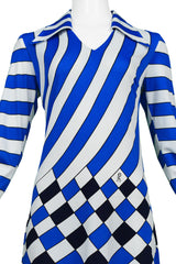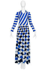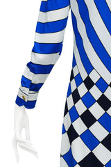 Resurrection Vintage is excited to offer a vintage multicolor Roberta di Camerino trompe l'oeil maxi dress featuring long sleeves, pointed collar, v neckline, and blue, black, and white graphic stripes and checker print.