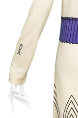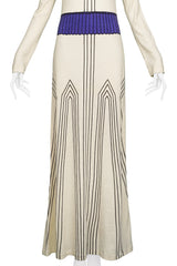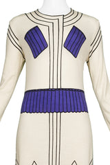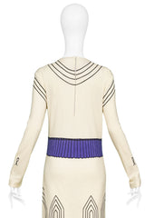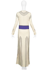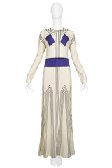 Resurrection Vintage is excited to offer a vintage off-white Roberta di Camerino trompe l'oeil maxi dress featuring long sleeves and blue and black Art Deco graphic details.