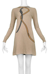 Resurrection Vintage is excited to offer a vintage oatmeal beige Roberta di Camerino trompe l'oeil knit mini dress featuring long sleeves, crew collar, and grey and brown "R" belt buckle print.