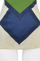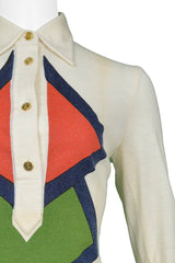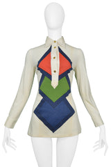 Resurrection Vintage is excited to offer a vintage off-white Roberta di Camerino trompe l'oeil red, green, and blue diamond print knit sweater featuring long sleeves, pointed collar, gold "R" buttons, and a center front placket. Light sun marks on the front of the shirt.