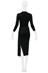 A stunning vintage Roberto Cavalli black embellished zipper dress. The dress features long sleeves, below the knee hemline, and asymmetrical gold-tone zipper from neckline to rear hem with gathered detail.