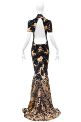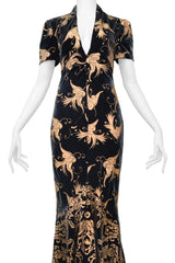ROBERTO CAVALLI GREEN VELVET GOWN WITH GOLD BIRD PRINT 2006