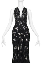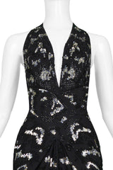 Resurrection Vintage is excited to present a vintage Roberto Cavalli black gown featuring silver sequin, silver & black beading, halter front & cross-back straps, and pleating along the front of the skirt.