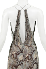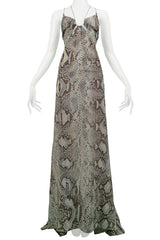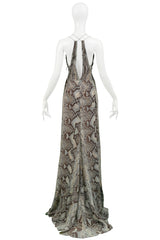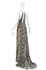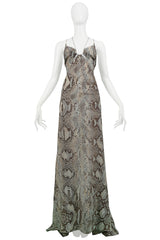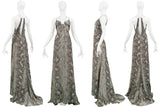 ROBERTO CAVALLI BLUE & GREY SNAKE PRINT EVENING GOWN WITH SILVER HARDWARE 2011