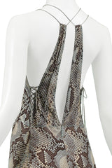 Resurrection Vintage is excited to present a vintage Roberto Cavalli blue and grey tone snake print silk evening gown featuring a cutout front bodice, cantilevered blue ties with silver spring hardware, lace up corset sides, exposed back, center back zipper, and gown length and back train.