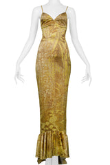 Resurrection Vintage is excited to present a vintage Roberto Cavalli Just Cavalli gold satin evening gown featuring abstract print, skinny straps, bustier bodice, ruffle hem, and gown length with train.