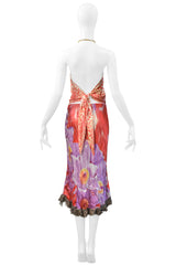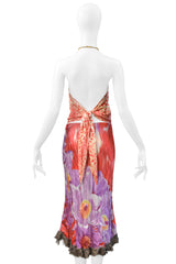 Resurrection Vintage is delighted to offer a vintage Roberto Cavalli red & purple leopard and floral two-piece set. The top features a gold chain halter neck adorned with crystals, leopard print, and is backless. The skirt features a bias cut, an elastic waist, raw hems, floral print, and midi length.