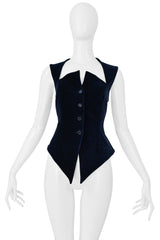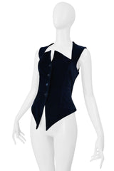 Resurrection Vintage is excited to present a vintage Romeo Gigli navy blue velvet vest from 1985, featuring front button closures, cutout design at neckline, pointed hem, and form fitting silhouette